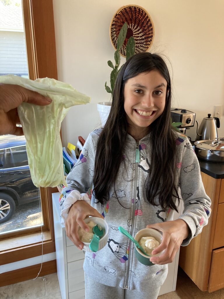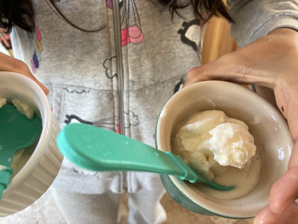 i did a science project on ice cream. How it works, you sake the bag for 10=15 mins. Then you put the salt in the bag, and then you shake it for 10=15 mins. This is how it looks after.